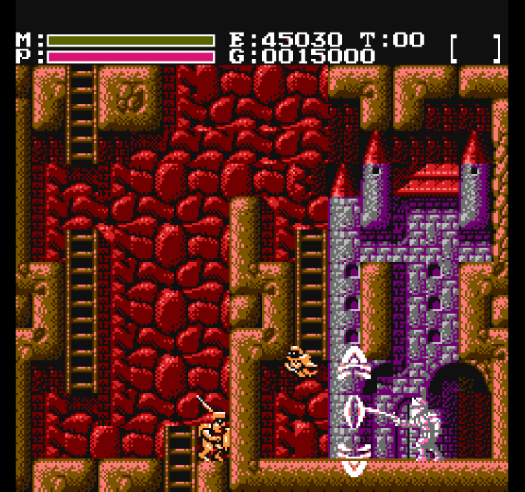 I loved the original Zelda games on the NES but I found the turn-based combat of Final Fantasy to be too slow and confusing, so when we looked at Faxanadu’s box in some store one day, it seemed like the perfect marriage of the two games to my young mind. There were swords and magic, yes, but you could also run around and slash at creatures to your heart’s content. I have a very specific memory of staring at the back of the box and thinking “yes. This is a good one. I want this.” That thought didn’t always lead to a good game – sometimes you’d buy or rent a game that had great box art and was a total dud. But this game sounded mature, epic, and the graphics were great, which was a big deal to me. I was pleasantly shocked when my dad read the back of the box and carried it to the front for purchase. How did I get so lucky? I so rarely got games and was well acquainted with “no. Put it back.” We rented games, sure, but a game purchase was a big deal. I was so excited to get those wingboots, whatever the hell they were.