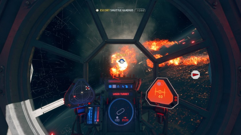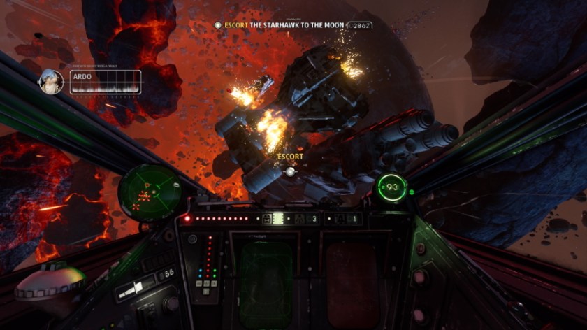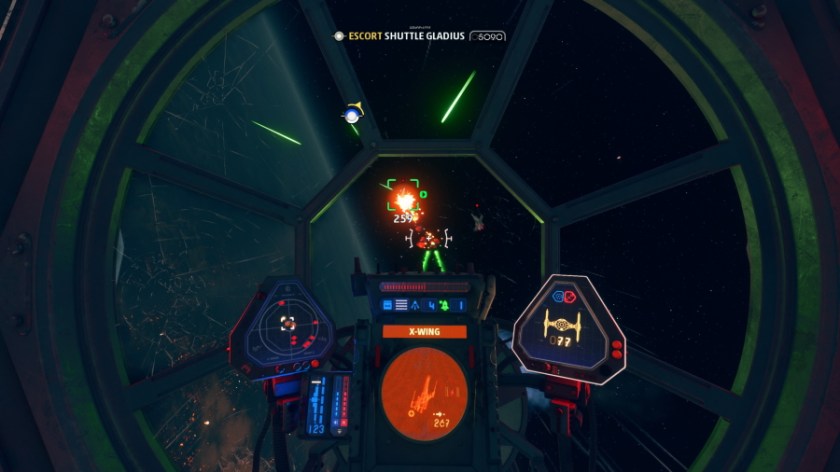 So, for me, that was the biggest win for this game: it feels good to play. Do I have to flip switches and monitor gauges? Yes, but there aren’t that many and it was very easy to pick up. It feels so cool to divert power to engines to increase the speed of my X-Wing toward a Star Destroyer, switch to weapons systems to launch a volley of blasts toward a shielding subsystem, then immediately cut to shields to make an escape. Well, try to make an escape. I’m often so determined to do as much damage as I can that I end up being destroyed before I can get safely away, heh. I was also a little nervous about the first-person perspective, as I usually prefer seeing the ship I’m flying, but I ended up really liking that, too. Again, my fears were unfounded. While I would like some kind of replay feature, where you see your ship and all the cool stuff you did from a third person perspective (like in the Ace Combat series), I found myself enjoying the cockpit view very much. Another one of my favorite experiences in the game is lining up a perfect shot on an enemy, unloading, and then bursting through the fiery remnants. I doubt it would be so thrilling in third person.