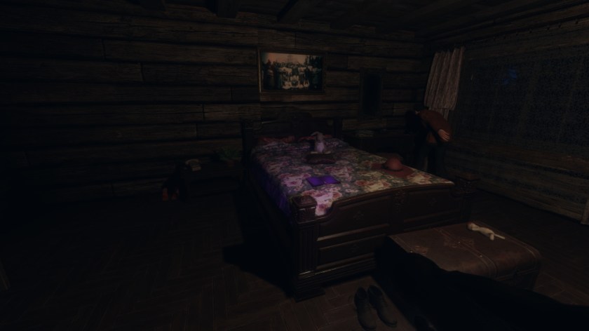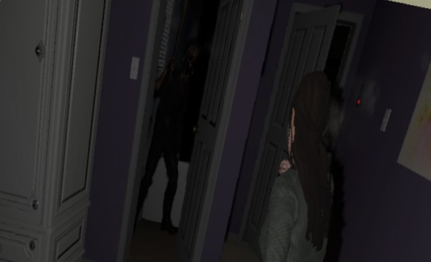 Let me talk you through a few pictures. First up is a ghost that killed me, stalking Ron. When you’re killed, you return as a spectral form, though you can’t do all the fun stuff that the evil ghost can. You can basically just follow your friends around and ask eerily “why didn’t you save me?” even though they can’t hear you. In this game, I died and watched Ron stand outside the front door, trying to call in and get the ghost to respond. He made the mistake of stepping just a smidge over the threshold, though, and the ghost seized its chance, shutting the door behind him and immediately entering its hunting phase. Ron couldn’t see the ghost but he could hear its heavy boots and gross, ghosty throat gurgles behind him. I, however, could see the whole thing. The ghost, an old man, jaw broken and half hanging from his face, wielded a machete and chased Ron to another room, where Ron was actually lucky to escape.