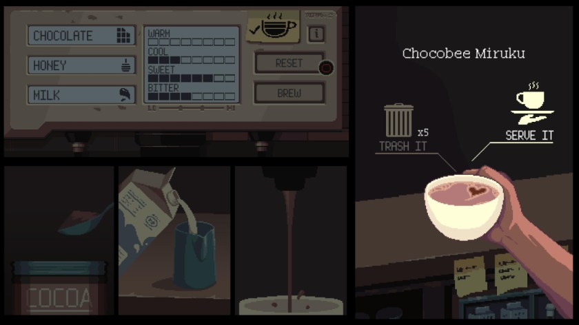 While I was somewhat disappointed in the lack of dialog choices and inability to form relationships with the characters that come into your shop, I did find the game relaxing and engaging. The drink making mechanics are simple, the stakes are rarely ever high, and I enjoyed the slight challenge of figuring out what kind of drink my patrons were asking for. The Seattle setting seems like a no-brainer for a game about a coffee shop, but I also think the choice to have the shop only be open at night and the constant rainy weather were perfect. They created a mood and ambiance that truly made me want to curl up with a cup of hot chocolate or coffee and just chat or read a book. Like a tasty, warm beverage, this game was a comfort and joy to play.