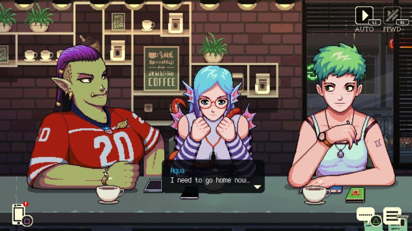 But, as I said, I did go into the game thinking the social mechanics would be a bit more… well, existent. As much as I like visual novels/narrative experiences, I always find myself wanting to be a part of the story that’s unfolding. I was hoping to form my own relationships with these characters, and when I saw how colorful and varied the cast was, I immediately thought there would be dating sim aspects to the story. Sadly, there are not, which is a real bummer because the game seems so perfect for it. When the latte art mechanic was introduced, I thought (not knowing there were no romance elements yet) it would be so fun if one of the ways you could flirt or reveal your feelings for a crush was by making a heart in the foam (if the game set it up as not unsolicited and creepy, of course). I am always curious about who people would romance in games, so if that also sounds like you, I think I probably would have gone for Aqua. Lua would probably also be a contender, but I feel comfortable saying Aqua is my… cup of tea. Thank you, thank you, I’ll be here all night. Anyway, while I did find the game a fun, soothing distraction for what continues to be a historically messed up timeline, I do have my fingers crossed for a sequel with more options for interactivity and immersive storytelling. And smooches.