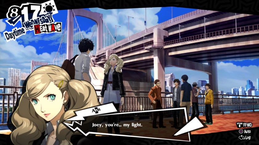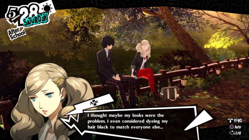 Although Persona 5 was my introduction to the series, I had some idea of what to expect in terms of gameplay and content before playing it. I knew there was a social aspect to its RPG elements, and you could increase your link with characters to the point where you romanced them. Being a fan of romance options in games, I had fun guessing who I might romance before I actually sat down to play the game. Makoto seemed like an obvious choice, followed closely by Kawakami (who I think resembles Alison Brie, particularly in the show GLOW, who is my celebrity crush). Ann? The seemingly stereotypical preppy, pretty girl? Nah. Booooring.