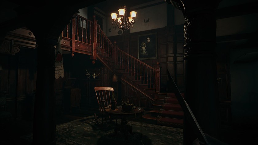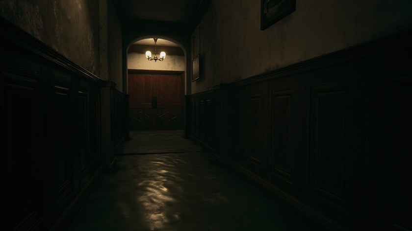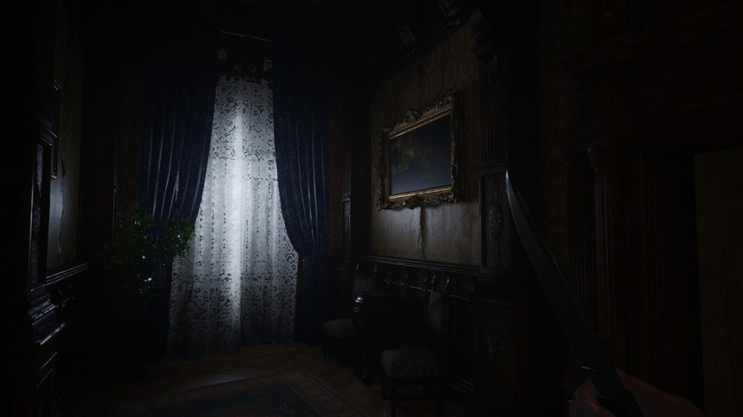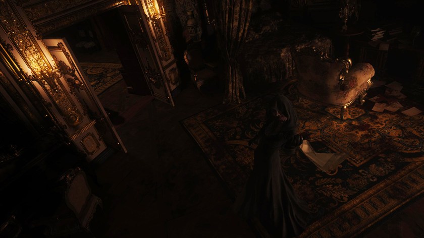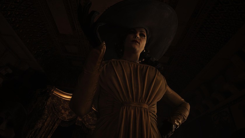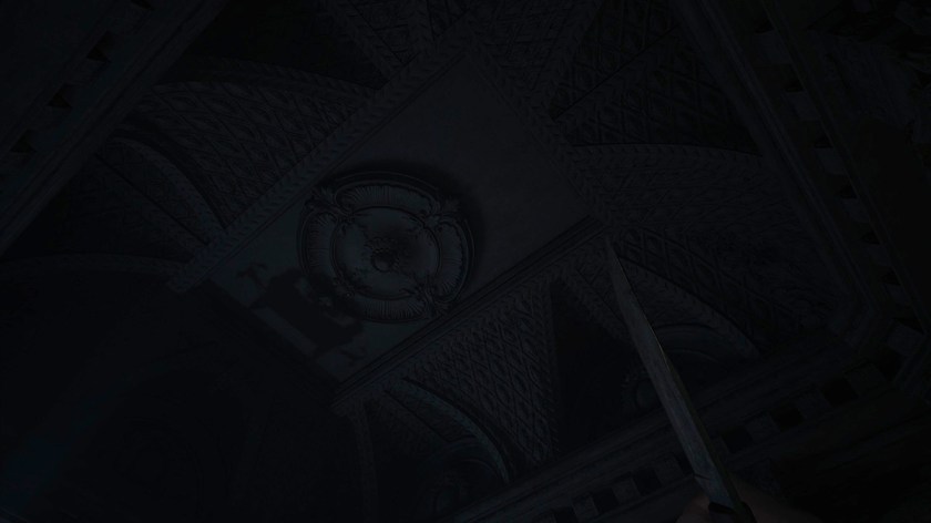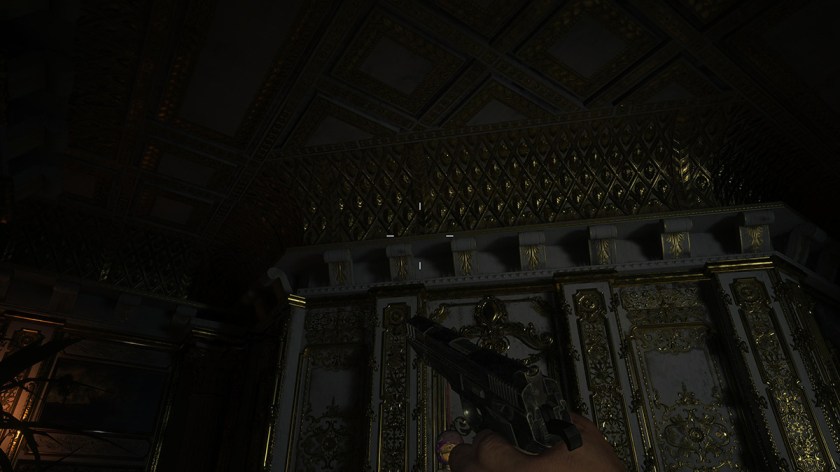 Our beloved Lady Dimitrescu’s castle is much like the lady herself: huge, beautiful, elegant, and I want to be inside it. Wait, what? Shhh. Let’s move on. At every turn I was overwhelmed by the level of detail in each new room or space I entered. Chairs, tables, shelves, a delicate teacup stained with lipstick and blood, a lace shawl draped over a regal couch with two black gloves thrown carelessly nearby. At some point I realized I’d also constantly been looking up at each new ceiling I stepped under. Ceilings in video games have long been an afterthought for game designers. Real house designers, too, I guess, but why would video game ceilings ever need to be unique and detailed? There’s never much of a reason to look at them. Yet here I was, constantly tilting the camera up to appreciate the virtual, digital woodwork, paint, and sculpting. I know that the designers use some kind of high resolution scanning technology to photograph objects and then render them in-game, so maybe these are real ceilings in some real castle or estate in Europe, but either way I was weirdly blown away by the care and attention that went into something as minor as this.