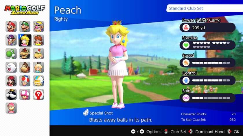 When I hit a ball in Super Rush, it feels like I tapped a button and a flat, white dot is moving over a flat, colorful facsimile of a course. The ball doesn’t feel like it has weight or depth, so it ends up feeling like I’m playing one of those old school golf games on the NES or various handheld systems. I’m not looking for ultra realism here. I didn’t go into this expecting Tiger Woods: Mushroom Kingdom Edition. But when I look at how good the production values were for something like Mario Kart 8, I can’t help but want other Mario games to at least attempt that same level of polish and depth. I wanted a Mario Golf game with tons of fun characters and courses. The courses that I’ve played have mostly been uninspiring. The opening course in particular is dull and confusing. It’s supposed to be a beginner course, but why not have it be a Mushroom Kingdom course? And why are all the holes so tightly woven together? For the “Super Rush” mode? The Mario games have so, so many amazing levels that you could use for a golf game, but we see so little of that same inspired design here. I don’t mean to sound so negative, and I do still plan to continue giving this game a shot (maybe if I play with friends I’ll have a better time), but this was the first time I’d picked up my Switch in a while so the sting of disappointment was a little harsher than it might have been otherwise.